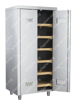 Шкаф ATESY ШЗХ-С-800.600-02-Р серии Стандарт используется на предприятиях общественного питания и торговли для хранения хлеба и хлебобулочных изделий. Модель оснащена распашными дверями с перфорацией и замком. Корпус выполнен из нержавеющей стали AISI 430, полки - из древесины.